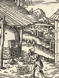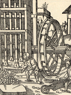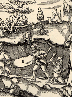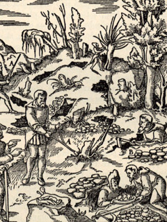 Obrázky práce starých horníků (prospekční činnost, těžba, drcení a tavení rudy) pocházejí z rozsáhlého dvanáctidílného díla De re metallica libri jehož autorem je neměcký učenec Georgius Agricola (1495 až 1555). Jeho zmíněná hornická příručka byla používána po stovky let a on sám je nazýván otcem mineralogie. Agricola několik let působil jako lékař v Jáchymově, kde díky své zvídavosti nabyl mnohých znalostí o nerostech a hornických technologiích.